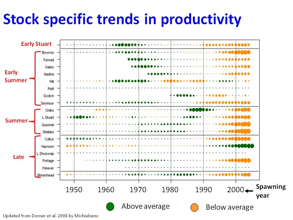 Last year was the big cycle year for this river/lake system that includes the Horsefly and several other rivers and it was a stunning failure. The calamity that struck all “Fraser” sockeye except the Harrison destroyed this run and this is a huge blow for Quesnel sockeye. It is possible the “dominant” cycle has been lost and a new cycle will hopefully take over as the most abundant generation.
