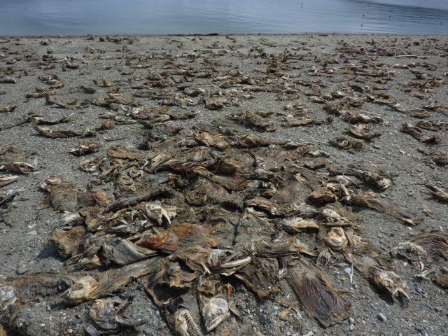 However the bodies of their parents were still incredibly abundant! I could not believe what was still there after the entire winter of predators and storms. Many still had eggs. These are the fish Dr. Miller is studying, the ones that make it all the way back to where they hatched, but die before they can lay their eggs. These are the fish affected by the virus that DFO has been keeping secret.