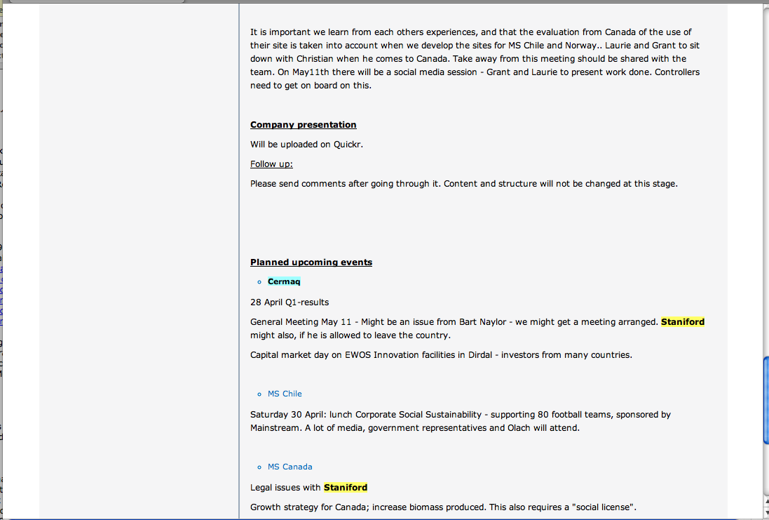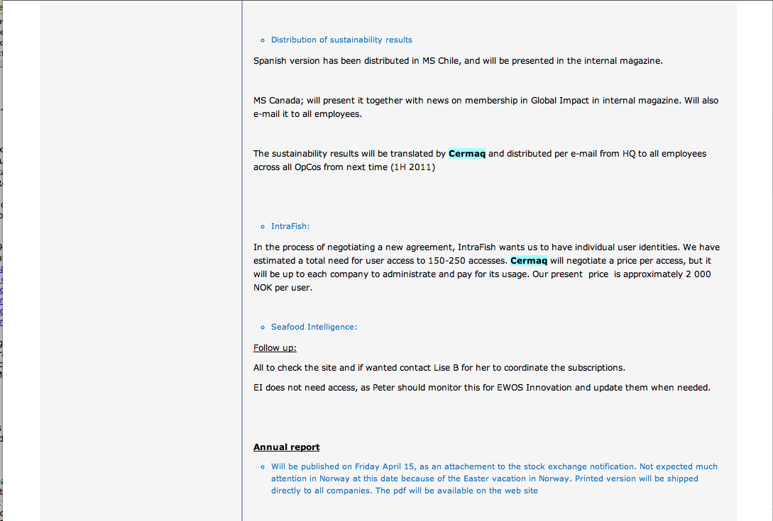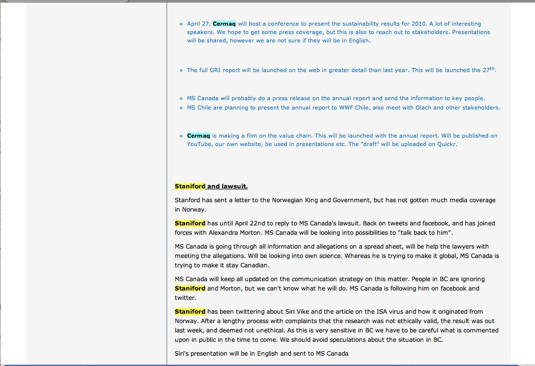 I have posted these minutes below. In this document Cermaq talks about how they are following Don Staniford on facebook and twitter because Staniford has been twittering about ISA virus “and how it originated from Norway.”