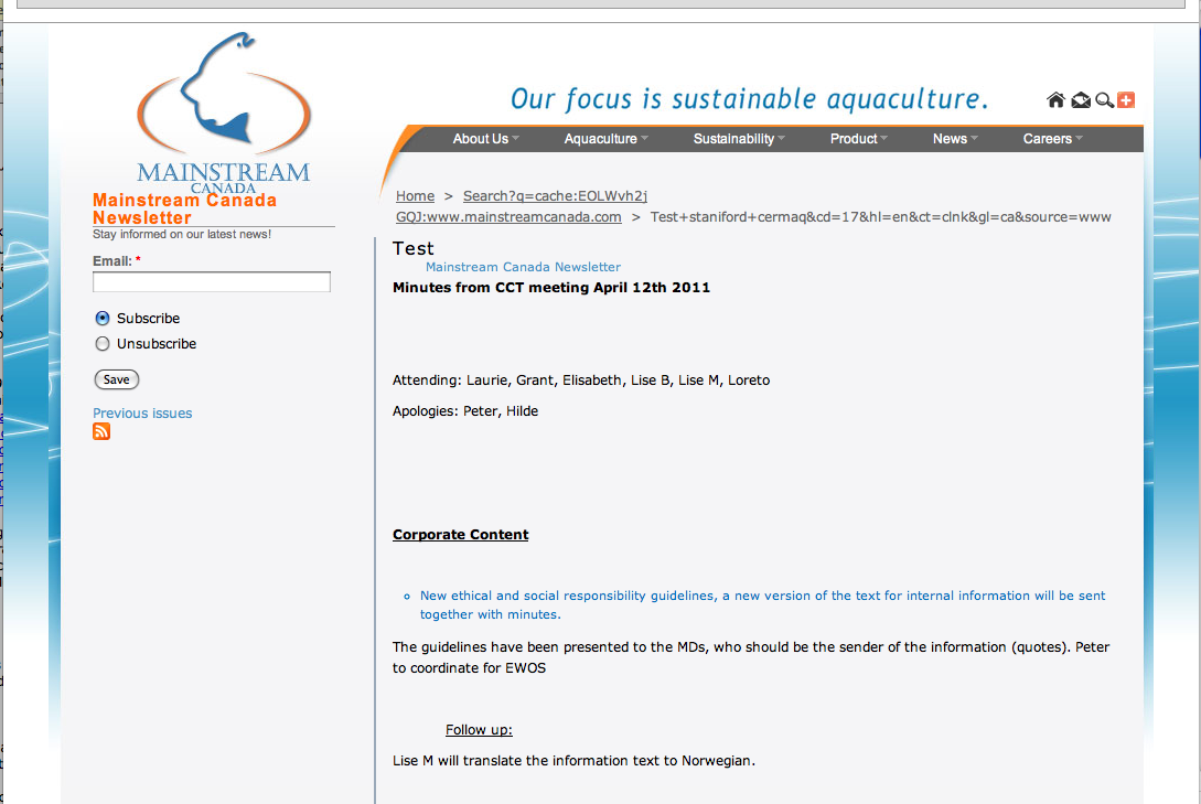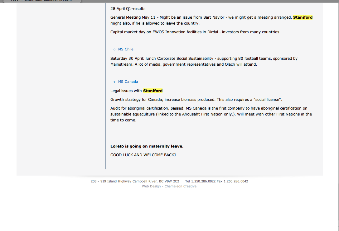 The Norwegian salmon farming corporation Cermaq, owned largely by the Norwegian government and called Mainstream in Canada, posted minutes of a meeting they had with their BC Corporate Team, Laurie and Grant, on April 12, 2011.