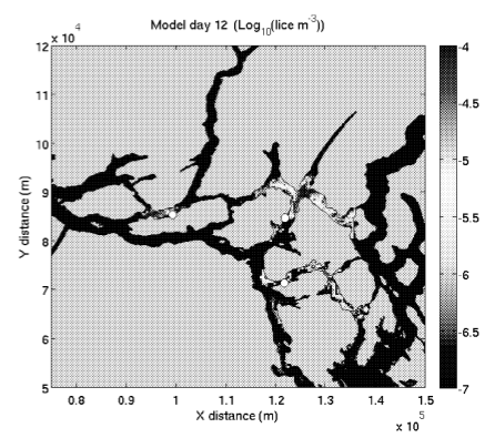 In this figure, black is water and you can see two white circles which represent salmon farms. The grey patchy areas are the “viral particles” leaving the farms and they completely fill parts of the channels. This means as sockeye travel through this area there would be no opportunity to avoid viral particles during a salmon farm disease outbreak. Salmon breathe by passing water over their gills, so the oxygen in the water comes into contact with their bloodstream. This means as a wild salmon passes through a salmon farmed region, salmon farm-origin pathogens leaving the farm fish’s bodies comes into contact with the bloodstream of the wild salmon.