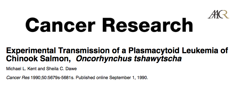While Dr. Michael Kent was Director of the Pacific Biological Station he studied the salmon leukemia epidemic in salmon farms in the Discovery Islands. In 1990, Kent sent one of the tumours to the Smithsonian Registry of tumours (Kent and Dawe 1990). His research indicated the cause was a virus, in fact he named it Plasmacytoid Leukemia. The salmon farmers opted for a shorter name and called it marine anemia. Kent published on this disease in Cancer Journals: