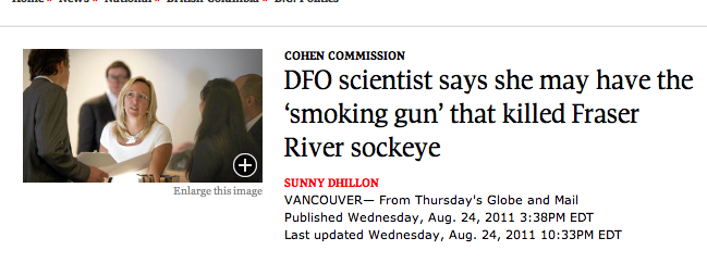 Three days ago, the lawyer for the Province of BC at the Cohen Inquiry refused to allow the fish farm disease databases to be entered as a public exhibit at the Cohen Inquiry. On Sunday night people started sending emails to Premier Christy Clark and at 2 pm on Monday the lawyer for the Province stood up and retracted their opposition and the BC salmon farm disease records became public. Finally, I can tell you why I think salmon farms have become the gatekeeper to Fraser sockeye survival.