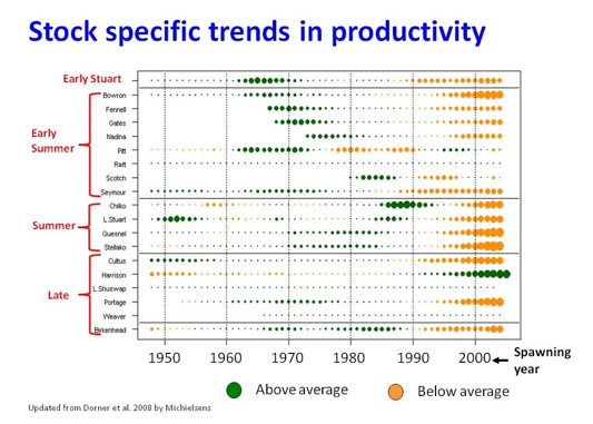 The blue line above represents the Harrison sockeye which are never found migrating north along eastern Vancouver Island. The red line is all the other runs, such as Cultus, Weaver, Horsefly, Stuart etc. Looking below while most of the Fraser sockeye stocks declined since the early 1990s (expanding yellow bubbles), the Harrison have increased over the same time period
