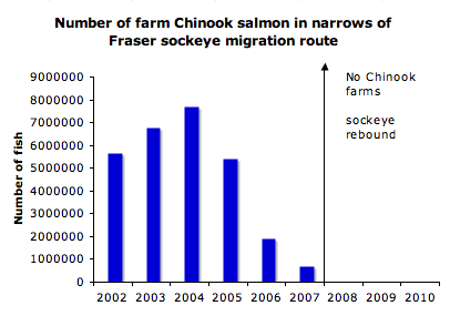 In 1992, the salmon farms were placed on the Fraser sockeye migration route, and the Fraser sockeye went into steep decline.