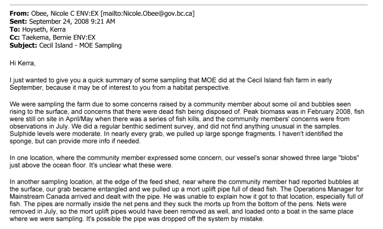 In July 2008, I contacted DFO to report oily gas bubbles rising to the surface close to a salmon farm called Cecil Island in the Broughton Archipelago, which is my home.