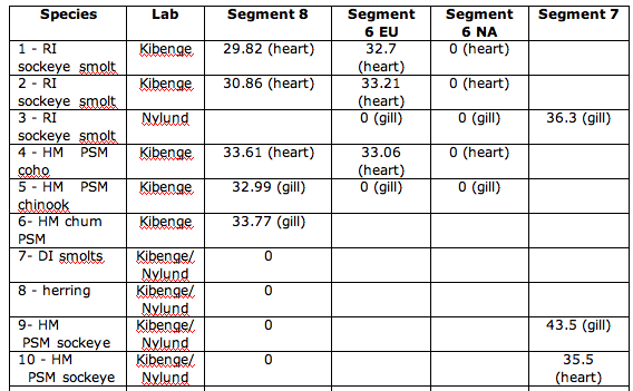 Table 2: RI = Rivers Inlet, HM = Harrison Mills, DI = Discovery Island, herring were from Sointula area. PSM = Prespawn mortality. While Dr. Kibenge tests segment 8 and 6, Dr. Nylund tests segment 8 and 7