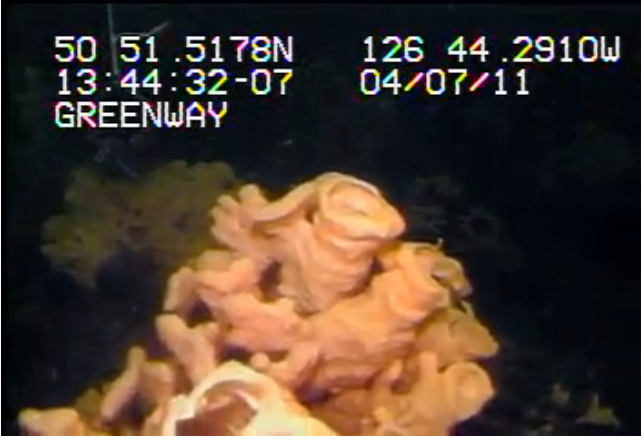 We choose deep sites to reduce the impact on the benthic environment, – Actually some of their sites are quite shallow like Sir Edmund and Cypress Bays at the mouth of Kingcome Inlet. Perhaps they have tried to reduce impact, but the bottom is dead in many places I have looked at around their feedlots. I have put cameras and gabbers down at these sites and there has been heavy impact. This is a picture of the seafloor near Mainstream’s Cecil Island feedlot, you can see smothered sponge reef habitat.