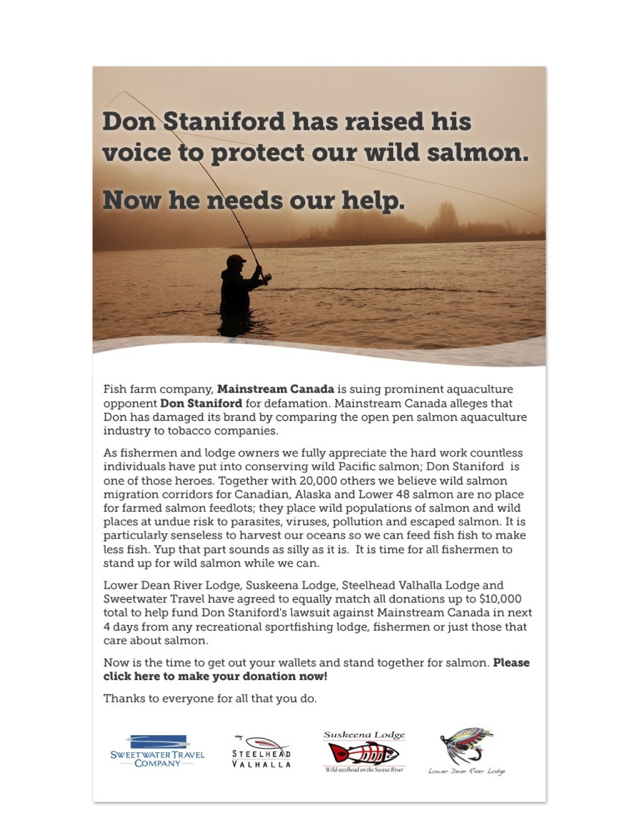 Fishing lodges are circulating this poster, challenging other lodges to help pay Don Staniford’s legal costs. More and more people realize if we want wild salmon it is up to us.