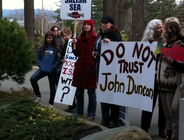 We stayed at the ferry until it left and then went to the Golf Club. There our numbers grew again and we formed a line holding our signs to the dinning room. We thought we should warn them about John Duncan MP, because the government he is part of hid the ISA virus positive test results from the federal inquiry into the Fraser sockeye.