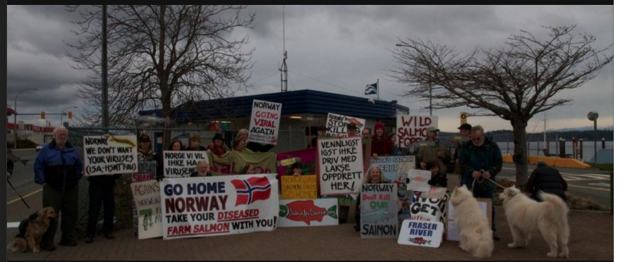 Salmon feedlots are dinosaurs, pouring massive amounts of wild fish into pens of fat Atlantic fish as if they will never run out. I would say to the angry young woman – don’t bet your job will continue no matter whether I stand on the side of a road with a sign or not. Trying to hold salmon in feedlots is just a bad idea that is running out of time. Their exploitation of global fisheries can’t last, there are not enough fish to sate their greed. They are playing games with THE most deadly salmon virus, an influenza that destroyed them in Chile – but apparently they did not learn from that. If you can’t see the value of millions of wild salmon pouring home to us every year, we can’t help you, but don’t imagine any of us standing there today profited from this – quite to the contrary. We are not the ones profiting.