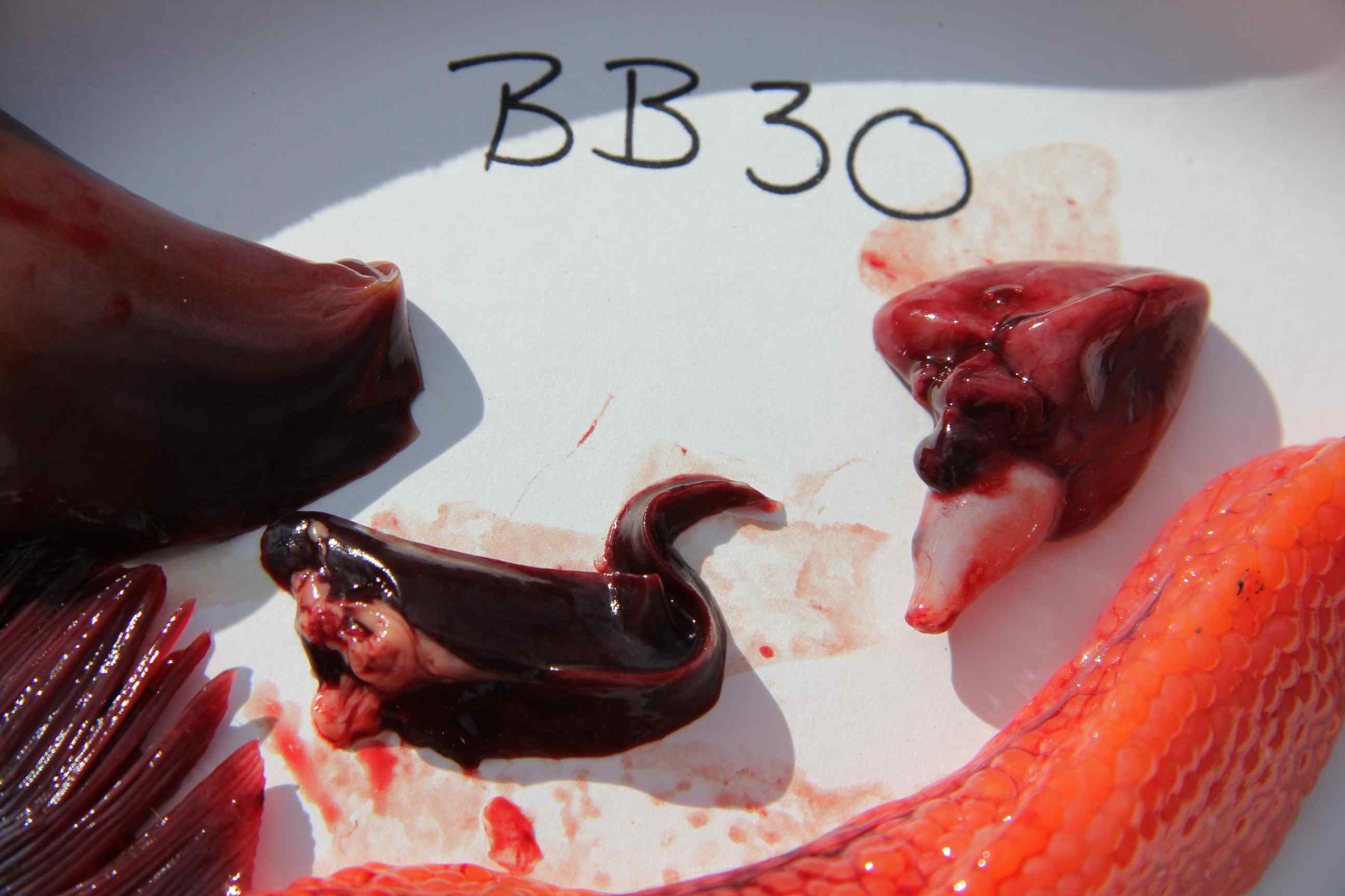 The spleen is the other organ of intense interest. In the Boston Bar picture above you can see the spleen is like a dark red, little flag with very sharp, crisp edges. But this spleen below from Adams Lake has rounded edges, and appears swollen.