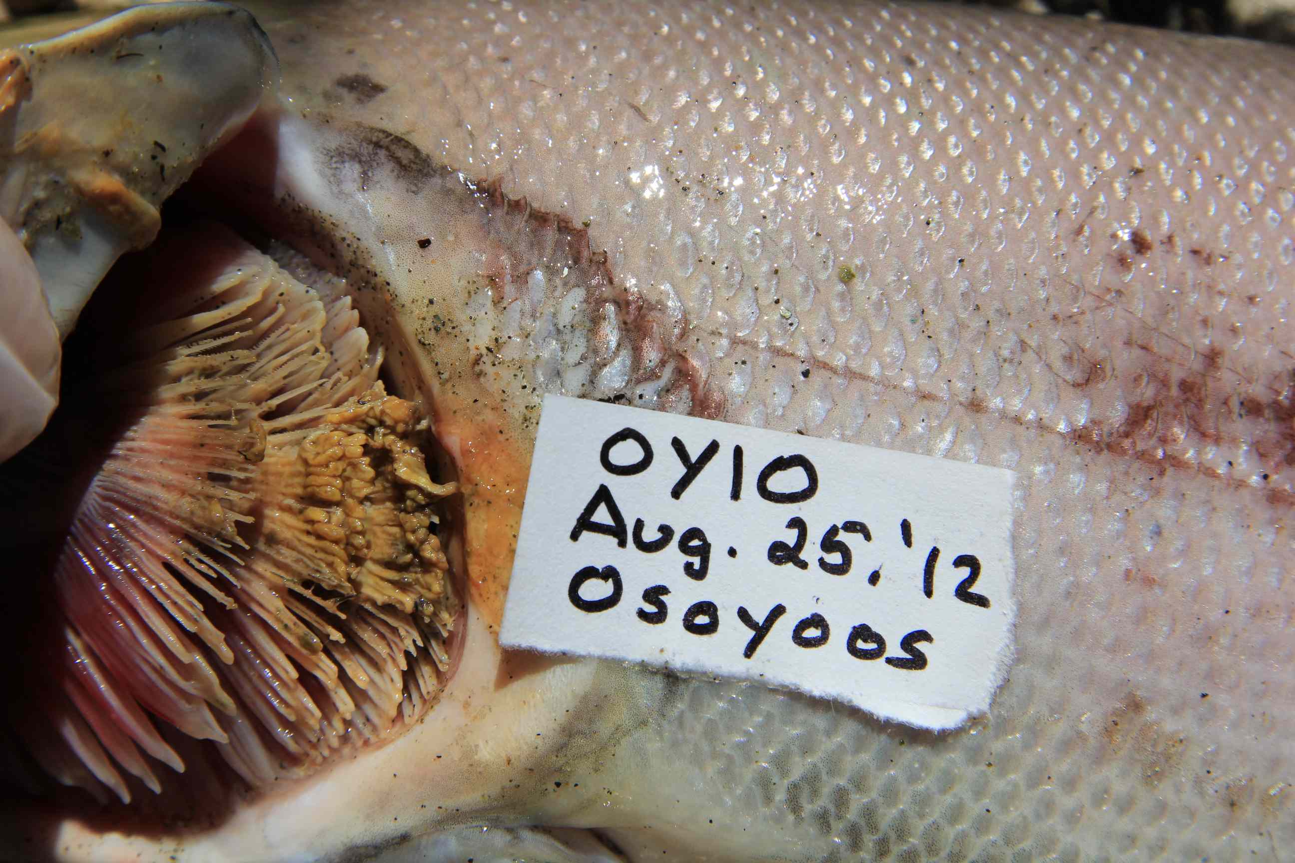 Gills are another organ with a lot of information about the fish. We went to Osoyoos Lake when we heard about the die-off there and found their gills were ivory white!