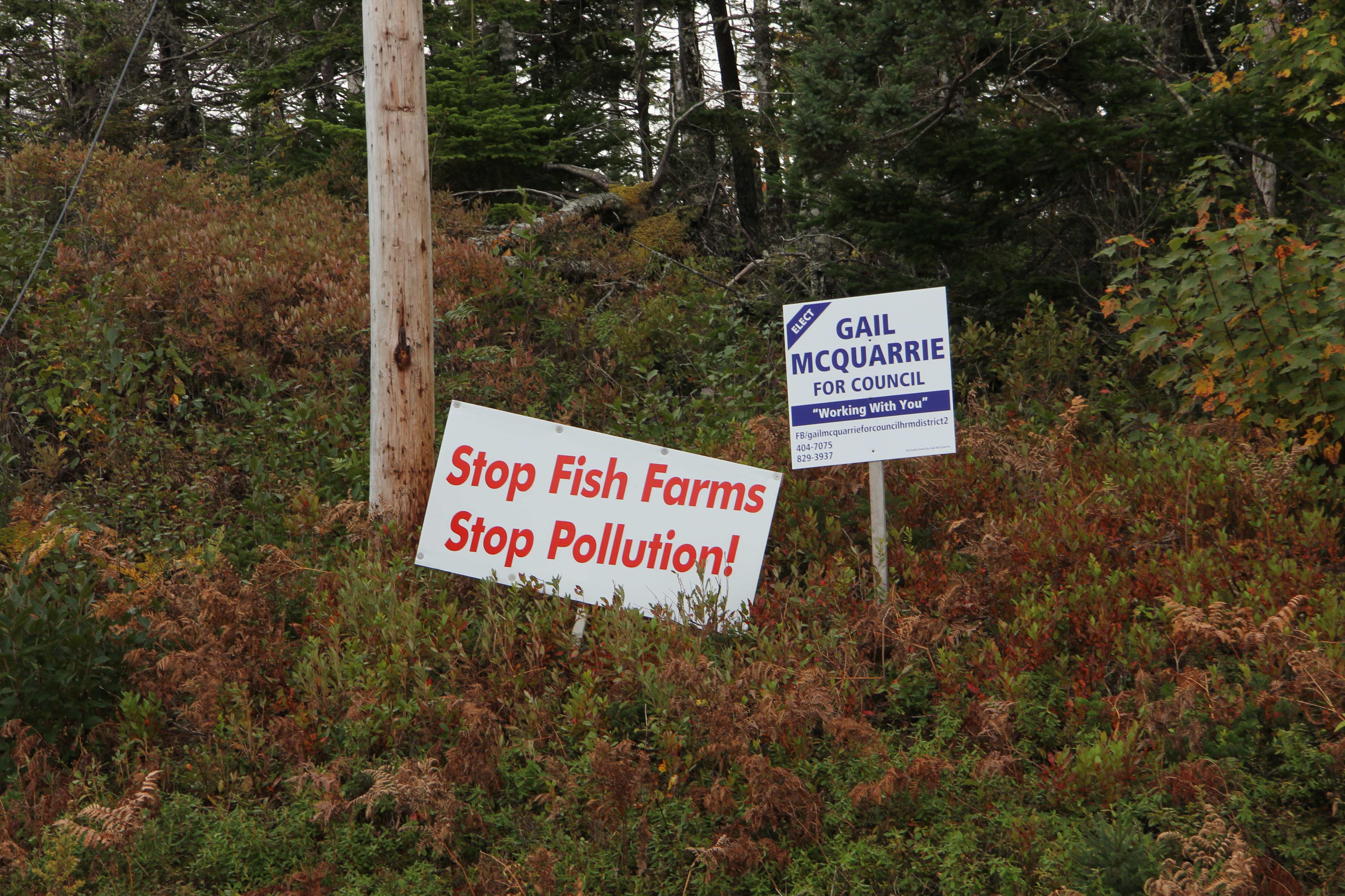 On October 11, I flew into the beautiful city of Halifax. At daybreak, Anissa Reed and I headed up the Eastern Shore. The leaves were red and orange, a soft wind blowing out to sea. We passed dozens of signs “STOP FISH FARMS,” “OPEN NET SALMON FARMS ARE NOT WELCOME!” Clearly there is a battle going on here.