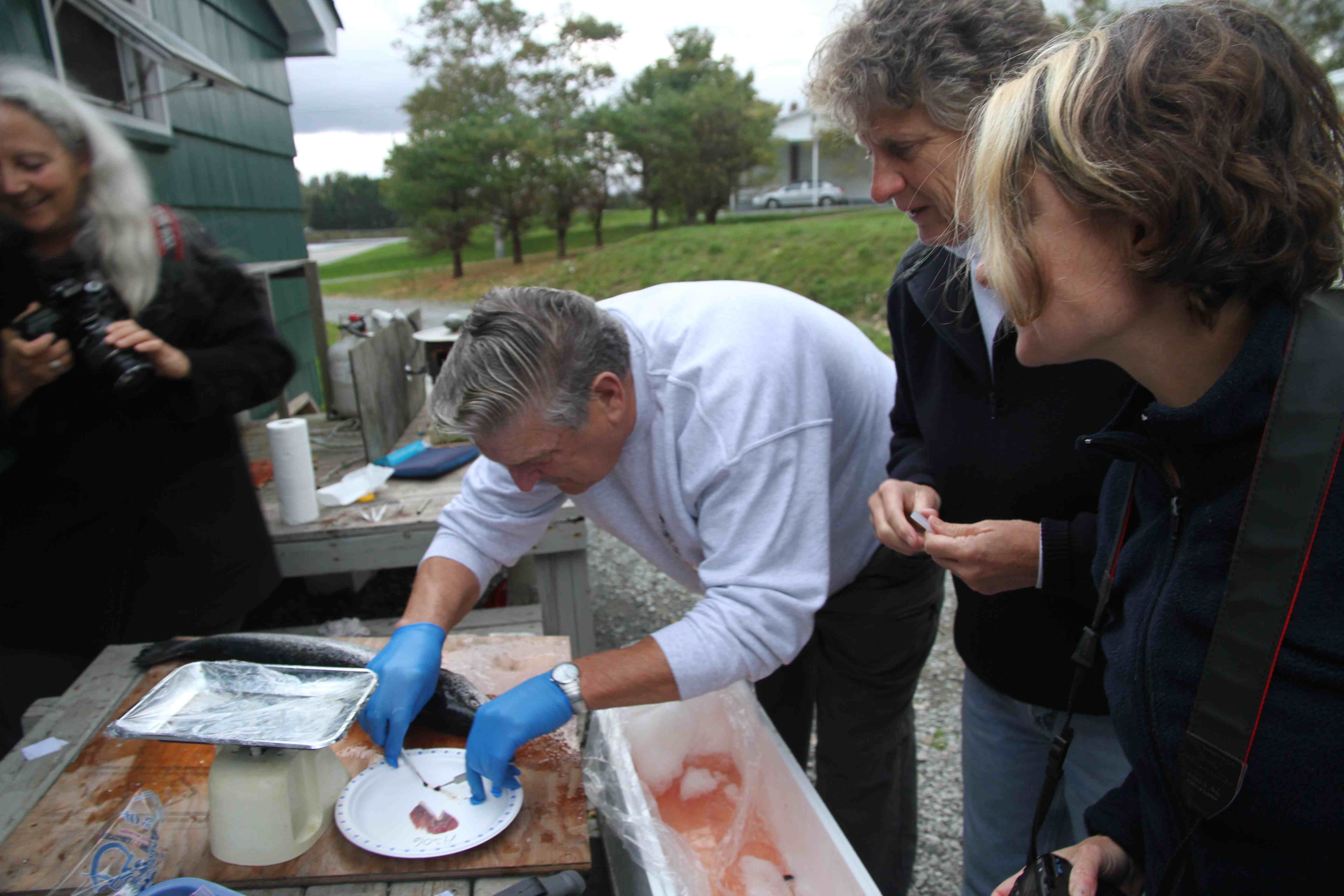 Bill showed us a stack of boxes a meter and half high containing documents collected and read since the beginning the year when this industry first began to threaten his way of life. Bill has risen to the challenge, doing things he never dreamed he would have to do becoming investigative reporter, spokesperson, defender of a place and a way of life he loves. We trained Bill to sample for the viruses that will be threatening the wild salmon and sea trout of his home.