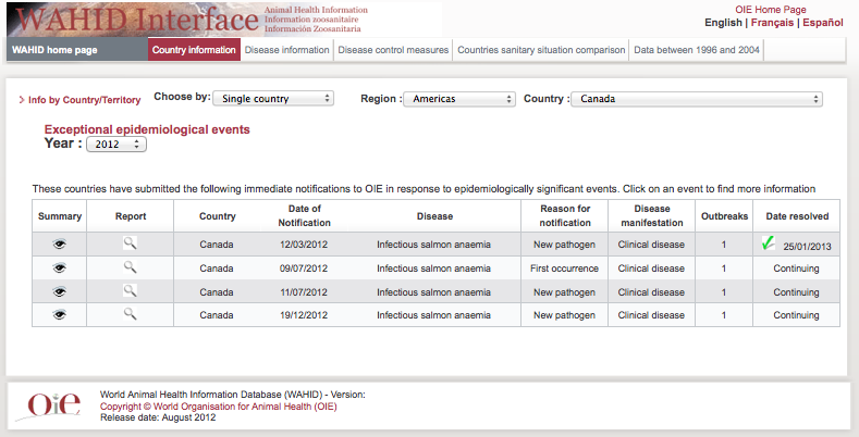 19/06/2012 – Newfoundland – “The strain of ISAV has not been reported in the Atlantic region before; it is believed to be a result of contact with infected wild species” entire farm depopulated, did not affect other feedlots in the area, no reporting on the name of this strain. Concurrent with BKD.