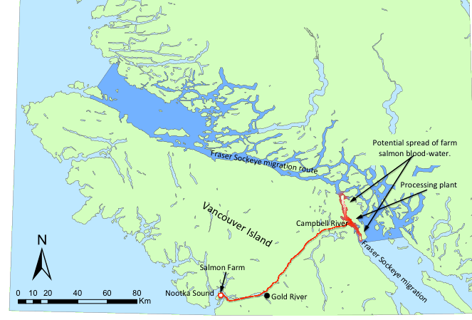 The Fraser sockeye are passing this pipe right now and from there they will spread out through the lakes and rivers of the BC interior. If an infectious disease is killing the salmon in your pens, it is washing over the wild salmon of BC on both sides of Vancouver Island.