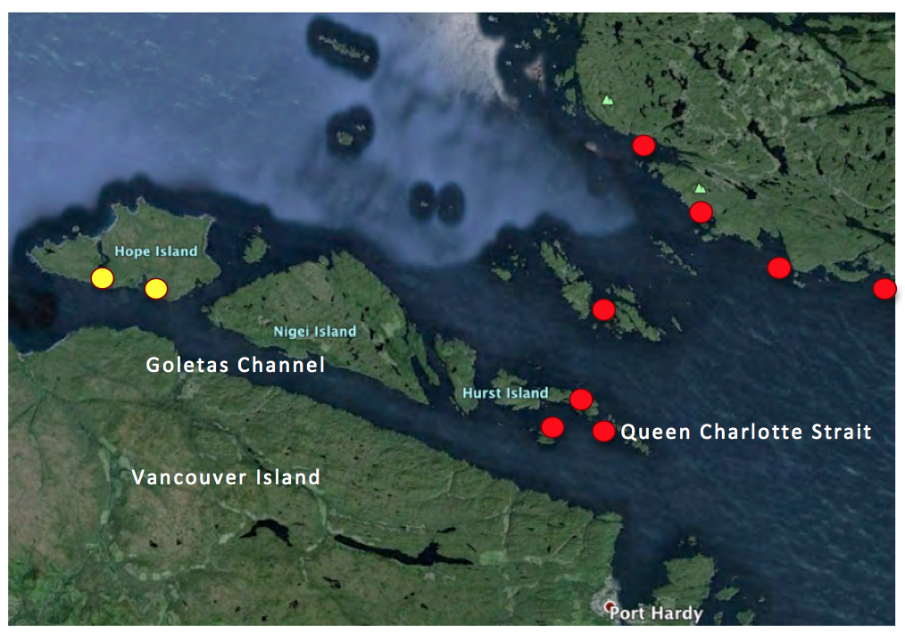However, similar to Alder Point, Goletas Channel is exposed to farm salmon effluent as there are 3 salmon farms (red dots, see map) lined up along the western edge of Goletas Channel. Goletas Channel is not “away from farms”, Goletas Channel is a highly exposed region. The two yellow dots are farm sites granted to Marine Harvest in 2015, which will increase farm salmon exposure for all the juvenile wild salmon passing through this area in 2016.