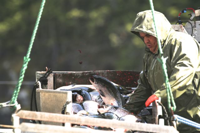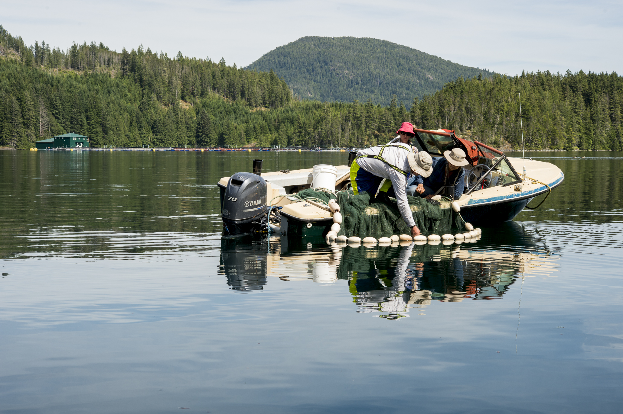 I spent this past weekend examining young wild salmon migrating through the Discovery Islands off Campbell River. These young salmon are leaving the mighty Fraser River to start their lives out in the open ocean as they have done for thousands of years, but today they have to swim through fish farm pollutants. I am studying how this pollution of viruses, bacteria and lice affects wild salmon. I have been looking at the salmon in this area since 2005. In this area I work with a team of highly-skilled locals who found themselves surrounded by fish farms.