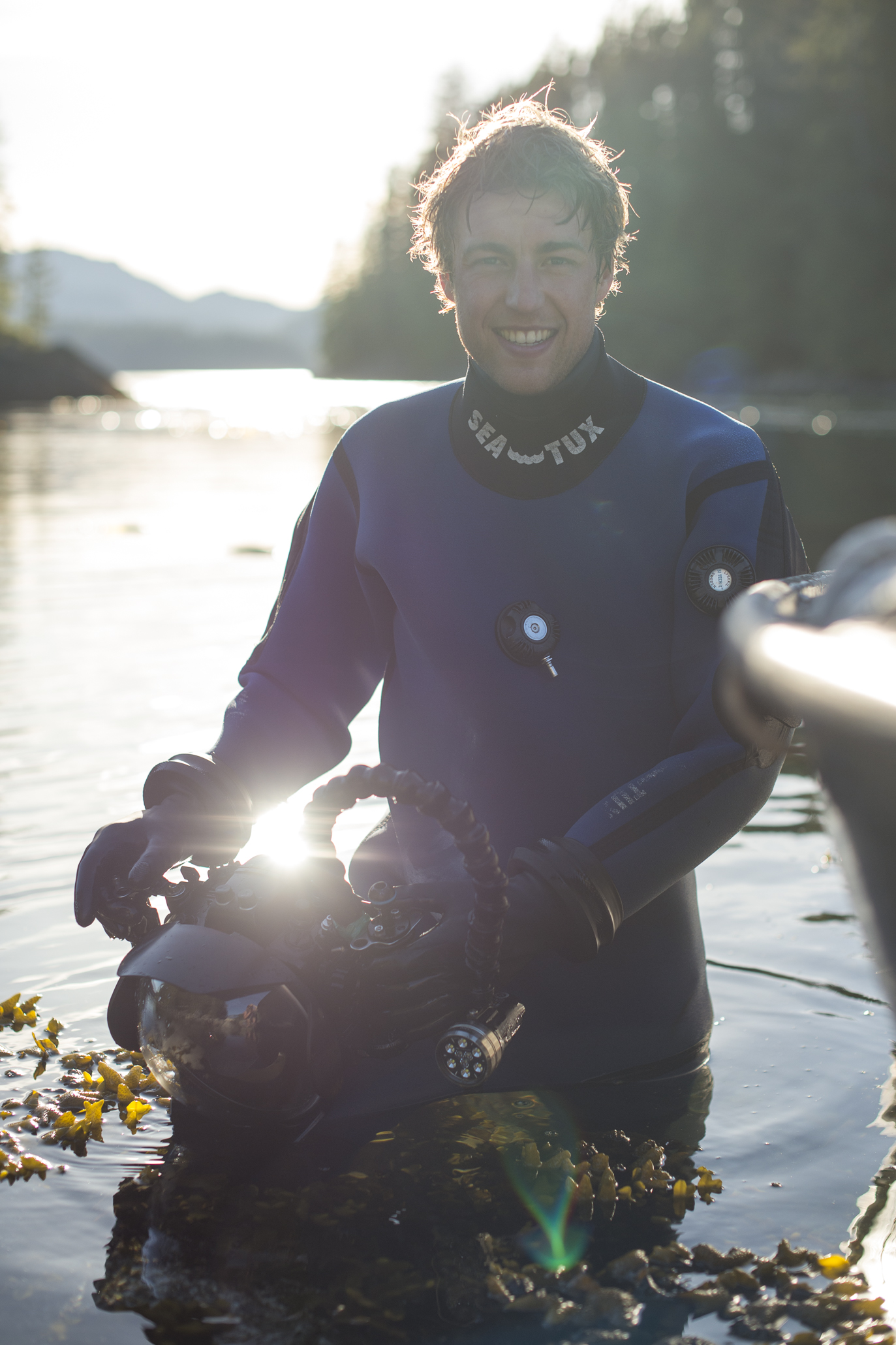 Tavish Campbell, gearing up here to try to document wild salmon traveling through the shelter of bull kelp forests underwater.