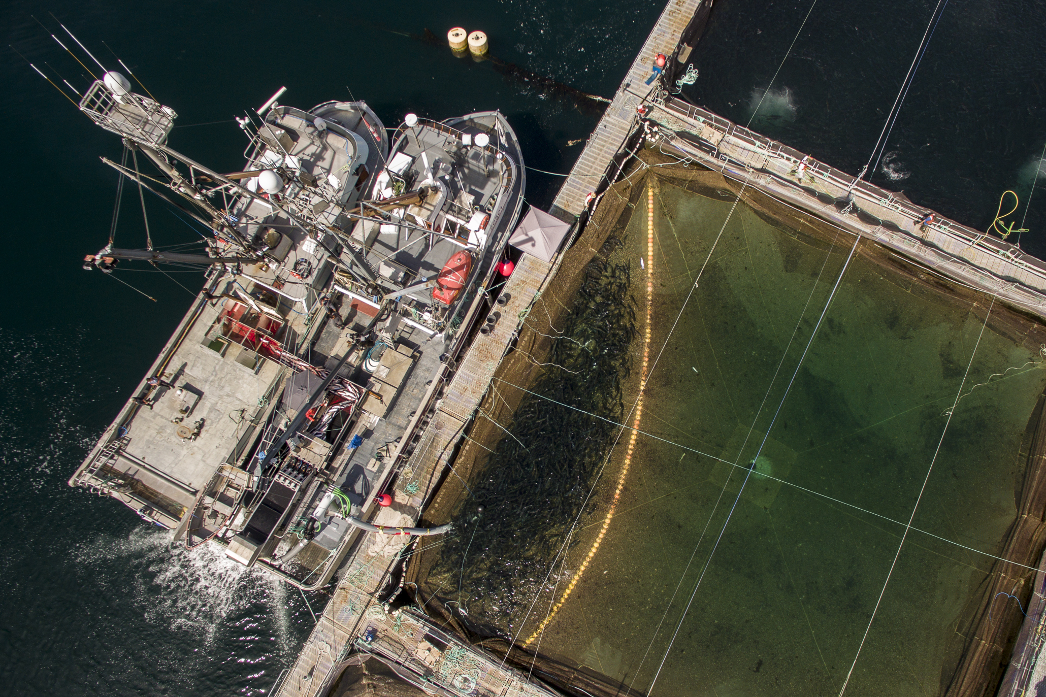 Here you can see two fishing vessels rafted to a farm where Atlantic salmon are being pumped out of the pen.