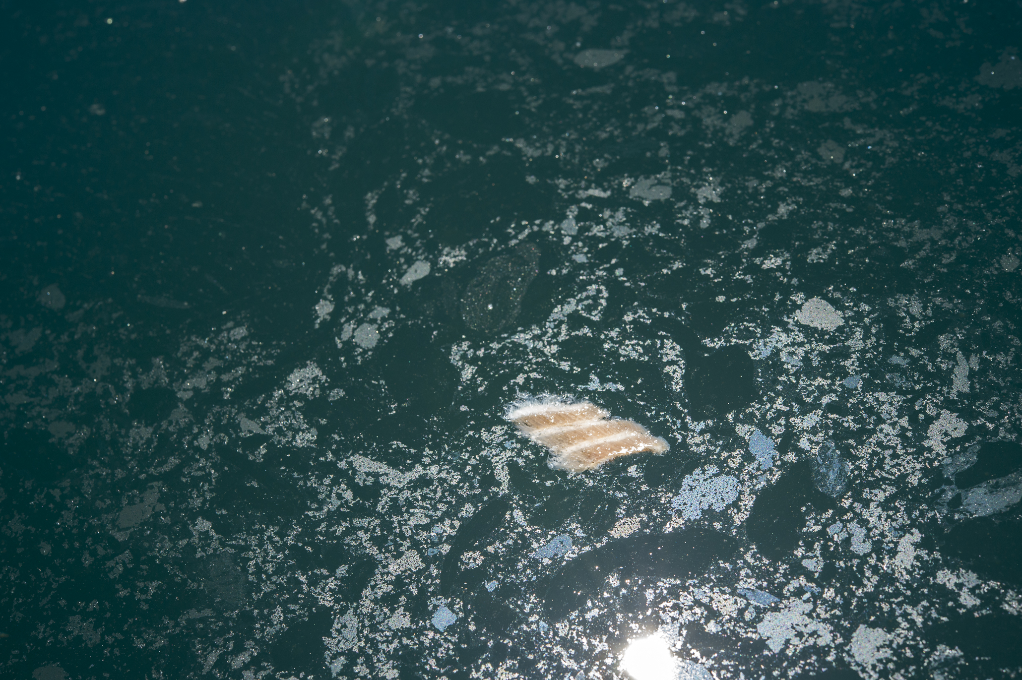 At another farm in Okissollo Channel we found ourselves adrift in a greasy stew of rotting chunks of farmed salmon complete with the tell-tale white stripes of fat and a smelly oil from the decomposing farmed salmon.