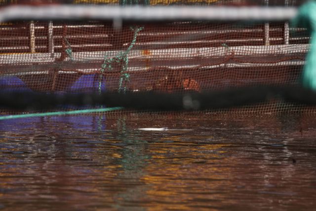 Here the net is pulled up to the boat and the fish are in the small circle of net left in the water