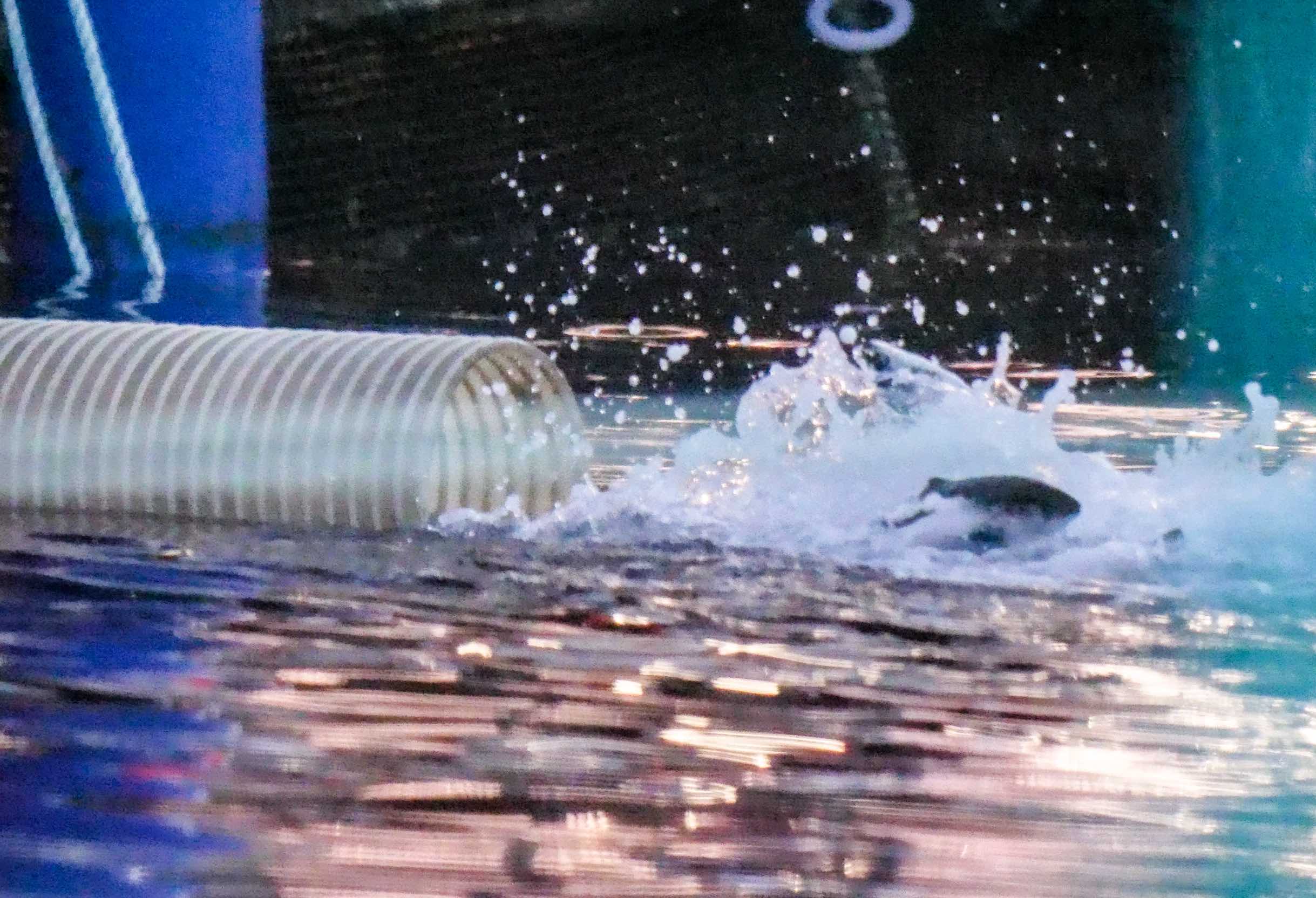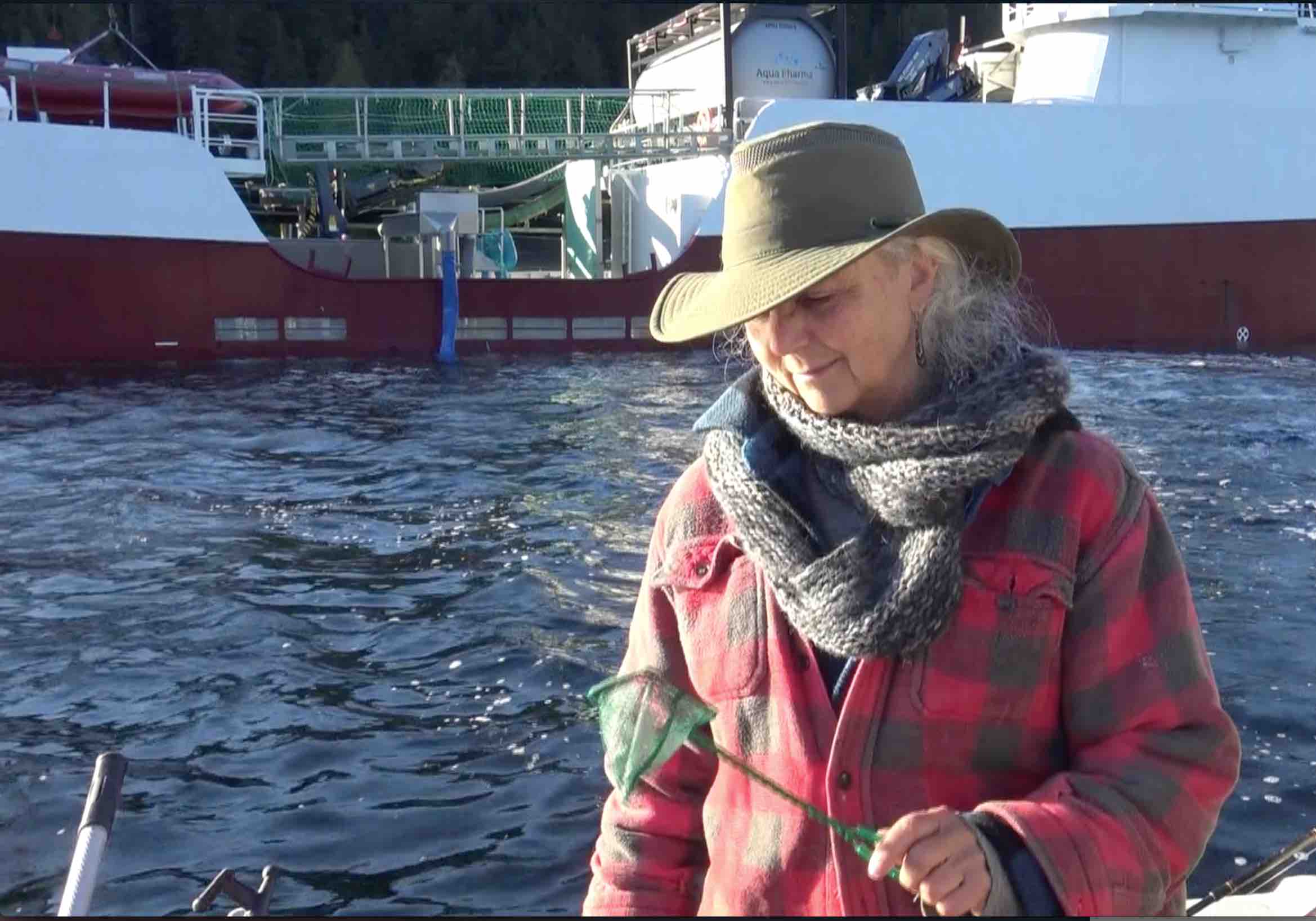 As we, the biologist and the school teacher, circled the farm a woman with POLICE across her back slipped out of sight in the Marine Harvest building tied to the farm. Another peered out a window showing only half his face, POLICE across his cap. We asked to speak to them, but they refused. The Viking extended a large hose across the walkway and young Atlantic salmon poured into the waters of Knight Inlet. I found a good position to film this, but Marine Harvest came up behind me towing a house and tied it up so the view was obstructed. The workers and crew laughed at how small we were against them.