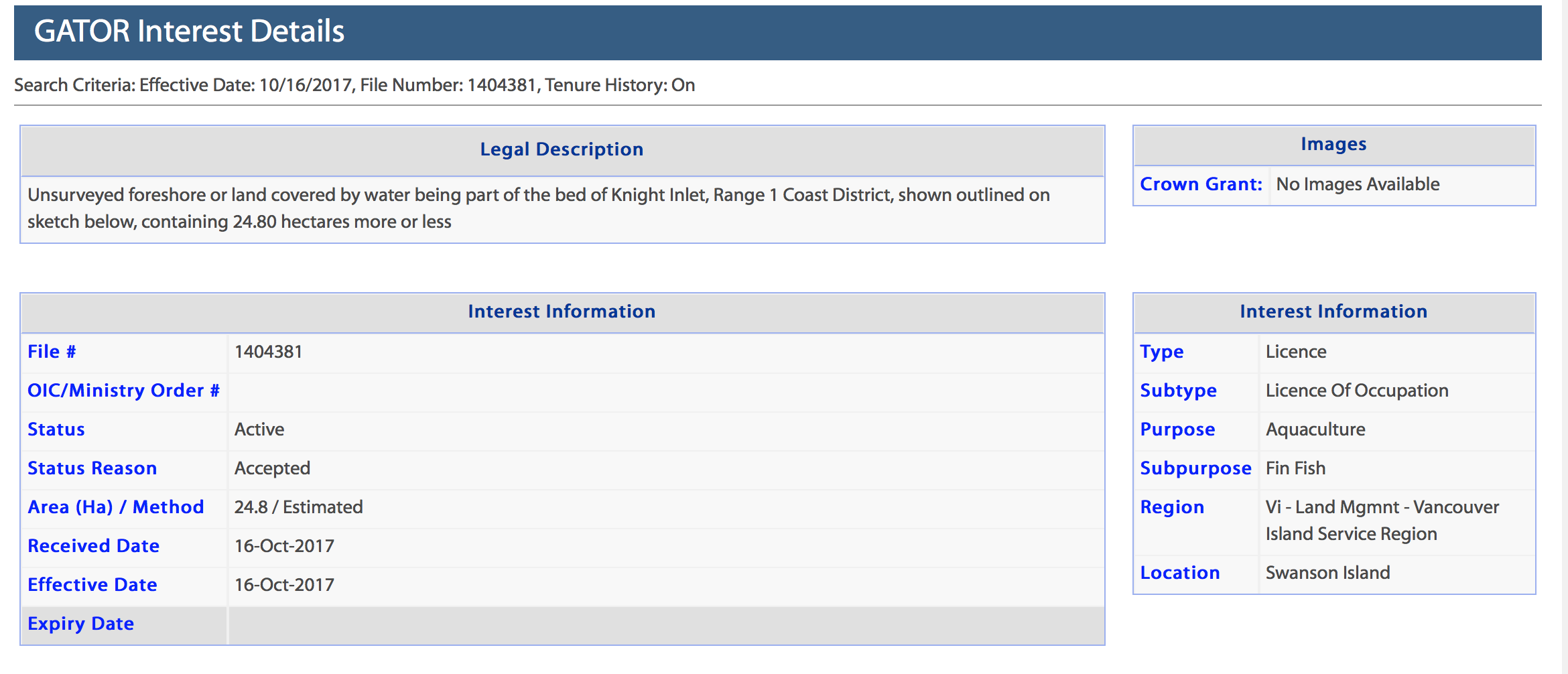 Below is a screen shot in regards to Swanson Island. I would like you to explain why your website states “Status Reason – Accepted” and gives an “Effective Date.” This is particularily concerning because you have refused to set a follow-up meeting with the Nations as promised in the Big House. Marine Harvest is restocking Midsummer Island, appears to be preparing to restock Swanson and Upper Retreat and has restocked Port Elizabeth, while Cermaq is actively restocking Sir Edmund – despite your warnings to the industry.