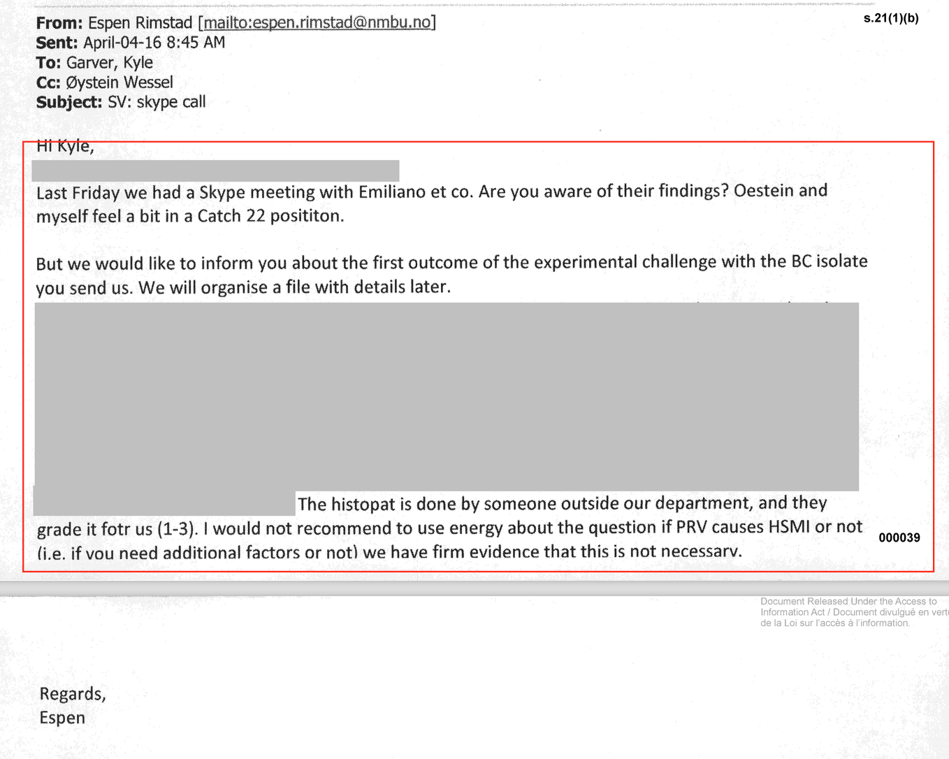 In April 2016, Rimstad wrote; “to inform you about the first outcome of the experimental challenge with the BC isolate you sent us.” His report on whether the PRV you sent him caused disease in his experiments is completely blacked out, but he sums up by saying “I would not recommend to use energy about the question if PRV causes HSMI or not… we have firm evidence that this is not necessary.” View this document