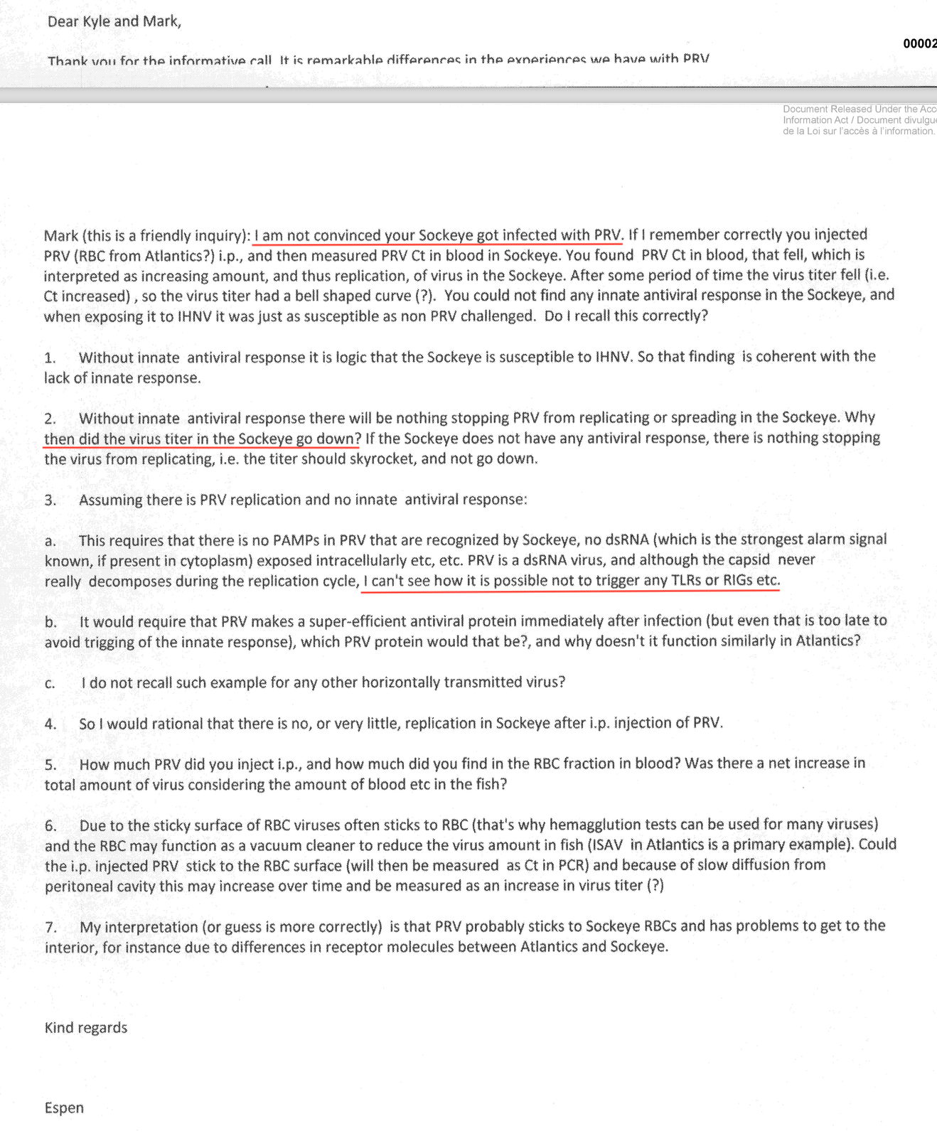 Thank you for your attention to these questions. The Fraser River juvenile sockeye which begin migrating to sea soon, will be exposed to the Browns Bay PRV-infected effluent and the many PRV-infected farms. These valuable runs cannot be managed optimally until the origin and impact of PRV is better resolved.