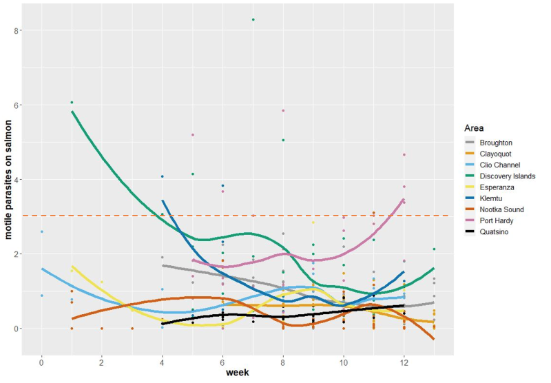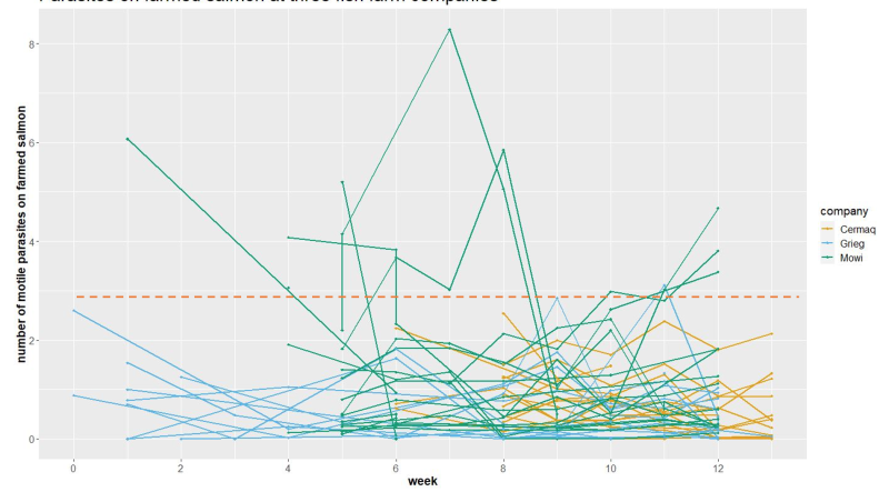 Figure 2: This is the average number of lice per farm, colour – coded by company. Mowi is currently reporting three farms above the threshold. These are the farms off Port Hardy.