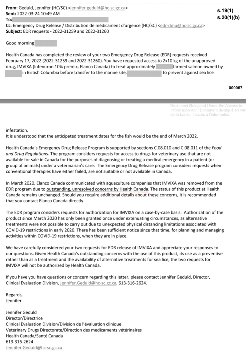 Meanwhile Cermaq tried again to get permission to use Lufeneron to fight sea lice, DFO supported this application, but Health Canada refused based on human health concerns.