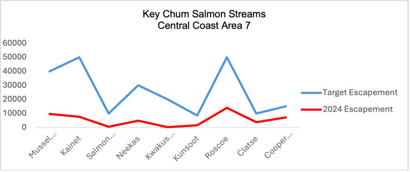 Area 7 prospects for the 2025 season include no anticipated pink or chum salmon commercial fisheries. “Over the past eight years, there have been consistently poor returns of Area 7 Chum. A positive rebuilding trend must be observed before commercial Chum fisheries can be considered” (DFO Post Season Review Central Coast).