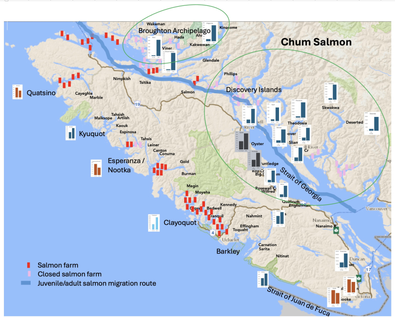 Figure 7. DFO post-season review graphs placed on a map showing wild Chinook and chum salmon returns from the 1990s through 2024 for Kyuquot (no salmon farms) Nootka/Esperanza (salmon farms) and Clayoquot (salmon farms). Graph source