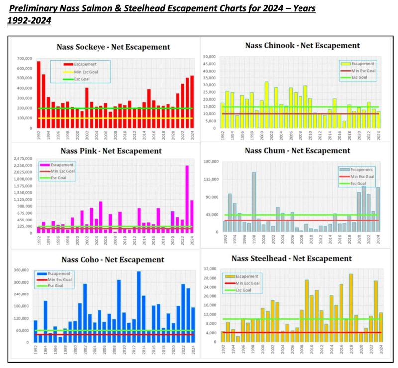 Figure 4. Preliminary Nass Salmon and Steelhead Escapement charts for 1992-2024. These graphs can be accessed from the 2024 DFO Post Season Review