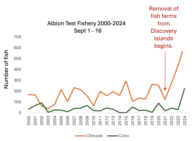Figure 18. The Albion test fishery, located on the lower Fraser River at Albion, BC (near Fort Langley), uses gill nets to assesses Fraser River chinook, Coho and chum salmon returns. The 2024 results are higher than observed in this 24-year data set. Data source