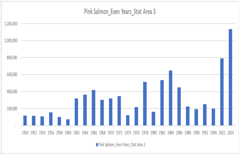 Figure 2. Pink salmon, even cycle returns 1950-2024 for DFO Area 3, the most northern region of the BC mainland (missing 1996, 1998, 2000) Graph Source