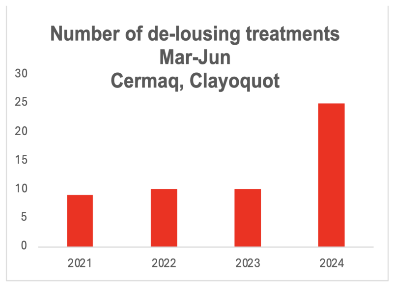 In 2021, Cermaq breached the Ahousaht limit 31 times, with up to 5 lice per fish. In 2022, they breached the limit 82 times, with infections as high as 21 lice per fish (DFO farm lice database). In 2024, Cermaq doubled the number of de-lousing treatments (Fig 14) and in August 2024 they stopped publicly reporting their lice numbers.