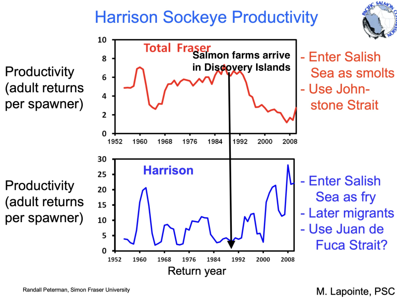 Figure 21 was submitted to the Cohen Commission into the 17-year decline of the Fraser River Sockeye Salmon. The salmon farm notation has been added. The red graph tracks productivity (how many sockeye returned for each member of the parental generation) in all Fraser sockeye and reveals a sustained collapse that corresponds with the arrival of salmon farms. The blue graph shows Harrison River sockeye did not collapse.