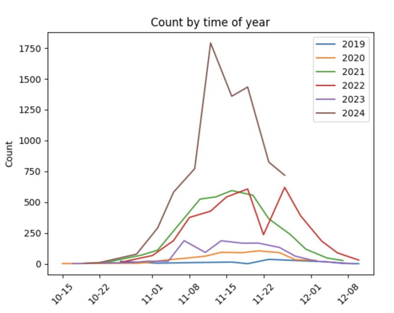Figure 14. Cermaq more than doubled the number of lice treatments during the spring juvenile salmon outmigration (Mar – Jun) from 2021 to 2024 Data source