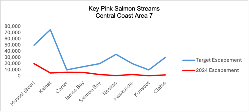 Figure 6. Pink and chum salmon 2024 returns (red line) vs the target number that fishery managers thought might return (blue line) to nine “key” rivers on the Central Coast. Data from DFO Post Season Review, pages 21, 22