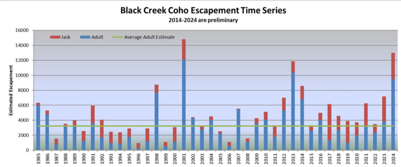 Figure 17. 2024 preliminary coho returns to Black Creek are “dramatically above” recent average and the 2nd best observed since 1996. Source