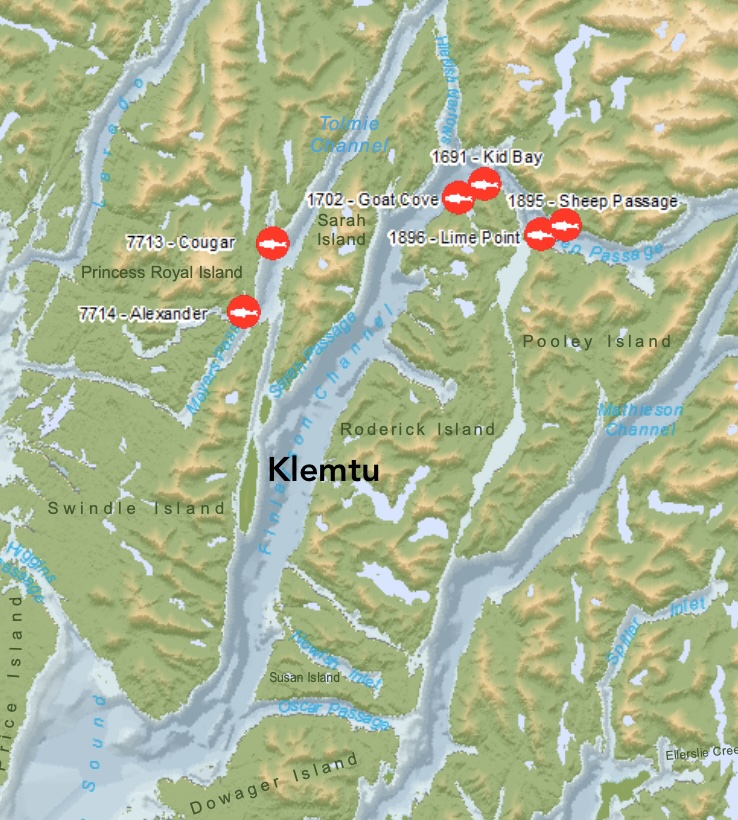 Figure 5. DFO Area 7 of the Central Coast has six active Atlantic salmon farms. These are the only salmon farms north of Vancouver Island.