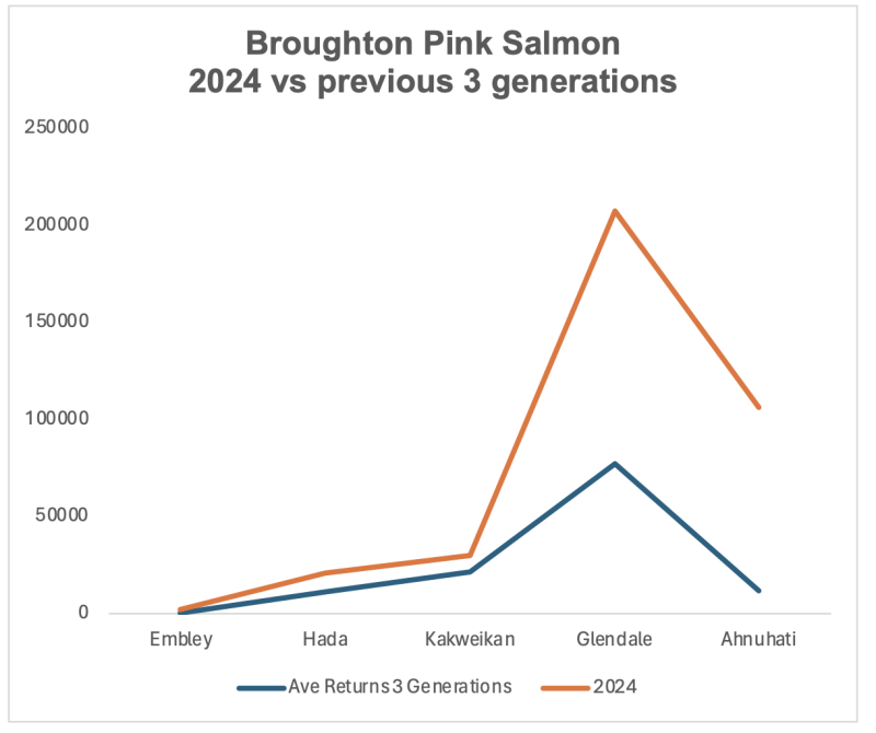 Figure 9. The 2024 returns to five Broughton pink salmon rivers vs average returns for the previous three generations. DFO data source
