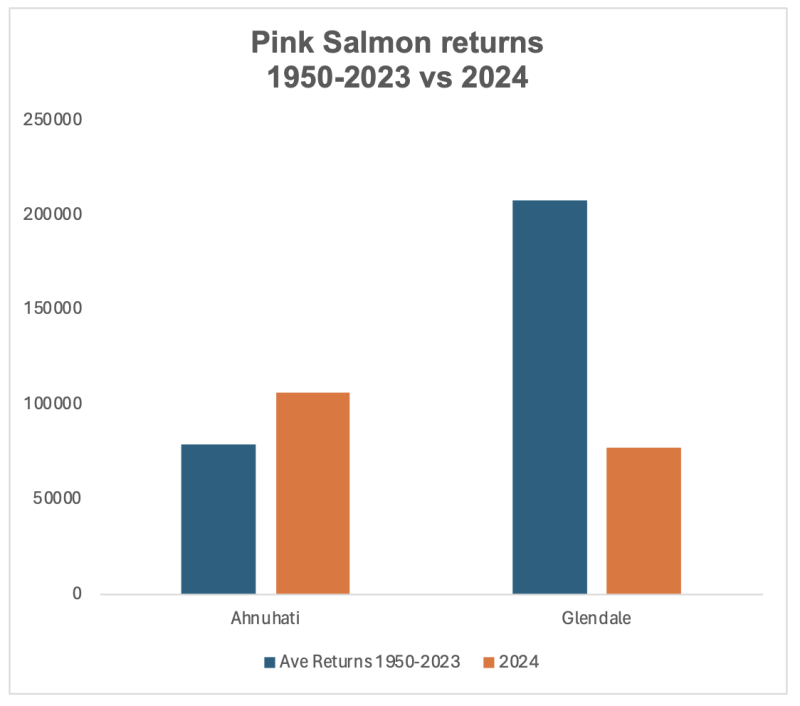 Figure 10. Average returns 1950-2023 vs 2024 for Knight Inlet rivers Data source