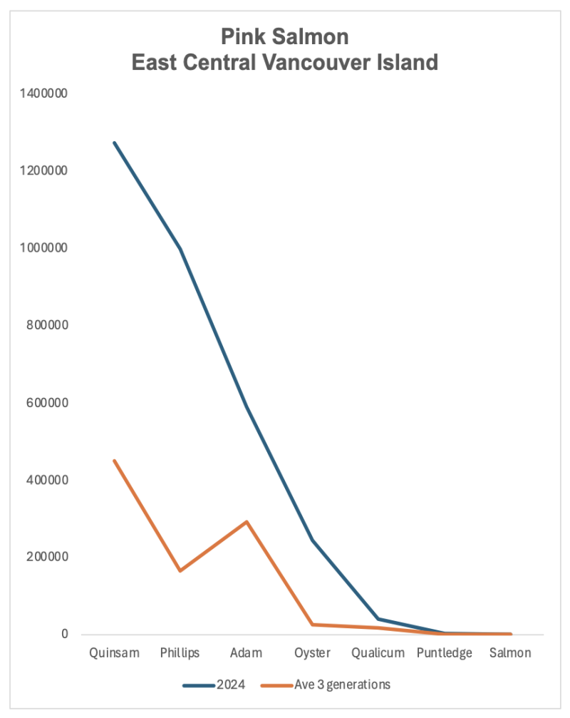 Figure 11. The 2024 pink salmon returns to east central Vancouver Island vs the average three previous generations. Data source
