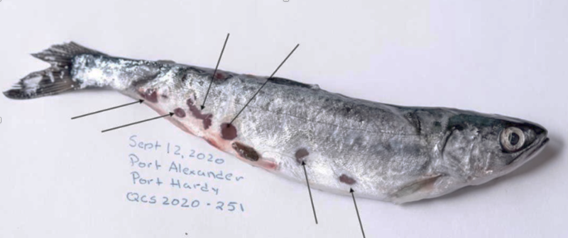 Figure 16. Juvenile chum salmon migrating past salmon farms off Port Hardy exhibited the classic open sore lesions that are associated with the disease Tenacibaculosis, caused by a bacteria common to BC salmon farms where it cause mouthrot.