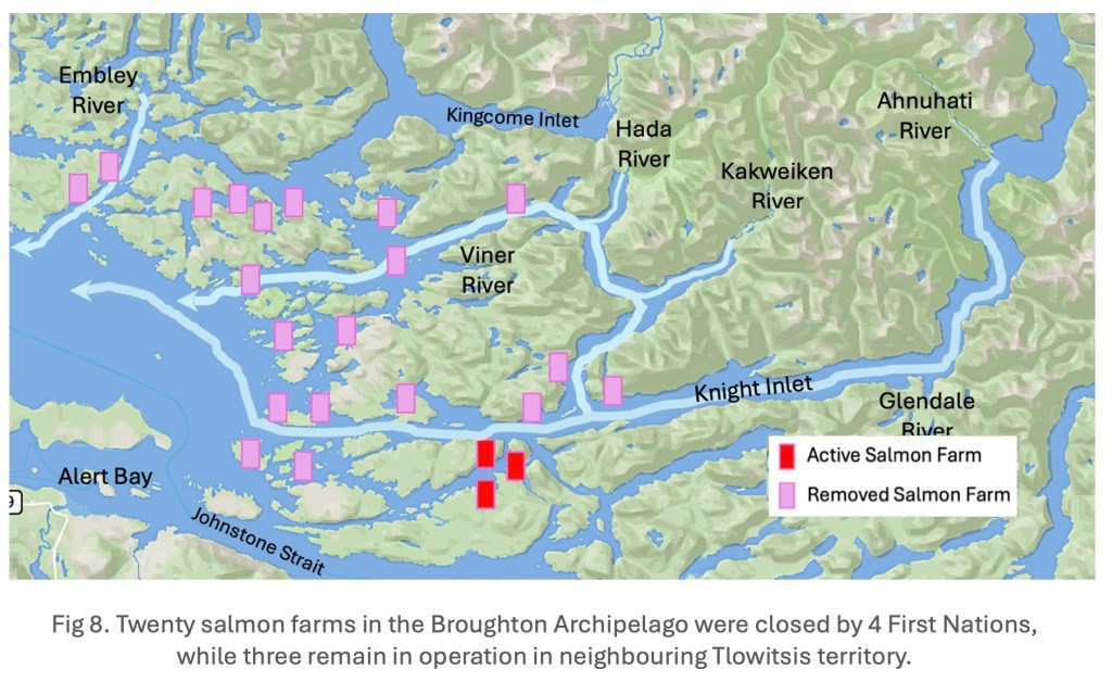 In 2022, the first return of Hada River pink salmon after nearby salmon farms had been closed increased 10-fold (~1000 to 10,000 fish), and doubled again in 2024 to 20,000. Ahnuhati pinks salmon, hovering at 11,879 for the past three generations, rebounded to 106,453. Embley pink salmon shot up ten-fold from an average of 283 fish over the previous three generations to 2,241. Because Tlowitsis allow 3 salmon farms to continue operating (Fig 8), an unintended experiment testing the impact of salmon farm is providing critical information.