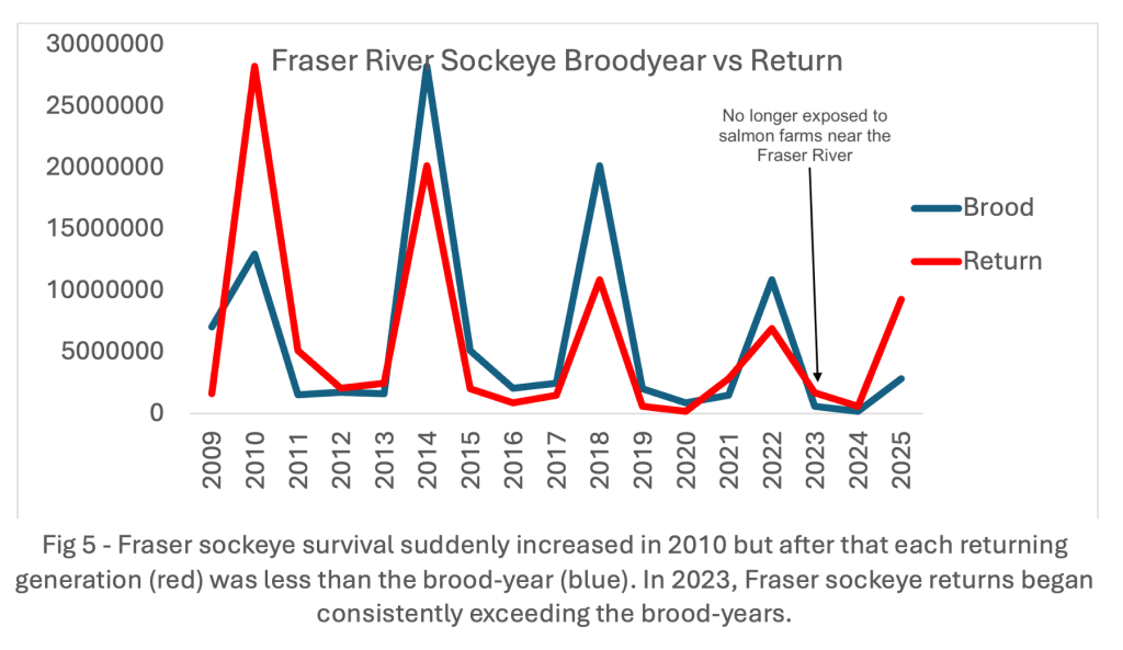 2022 was the last generation of Fraser sockeye that migrated through salmon farms in the Discovery Islands when they were juveniles on their way to sea and their numbers declined. Every generation since then, that did not migrate as juveniles through those farms, has returned in numbers significantly larger than their brood-year (Fig 3).